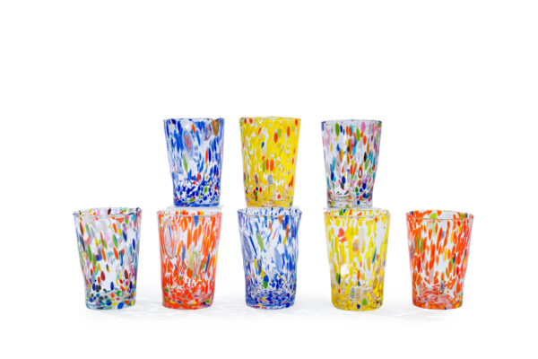 Juego de 8 vasos altos en vidrio soplado multicolor de Murano.