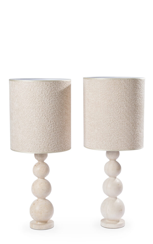 En mármol travertino realizadas a mano con fuste de esferas en tamaño degradé y pantallas en lana bouclé. Electrificadas.