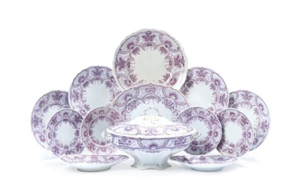 Maravillosa vajilla antigua de la fábrica «Hanley» modelo «York». En loza fina de color blanco con diseño de flores en púrpura, líneas en oro y bordes festoneados. Con marcas.